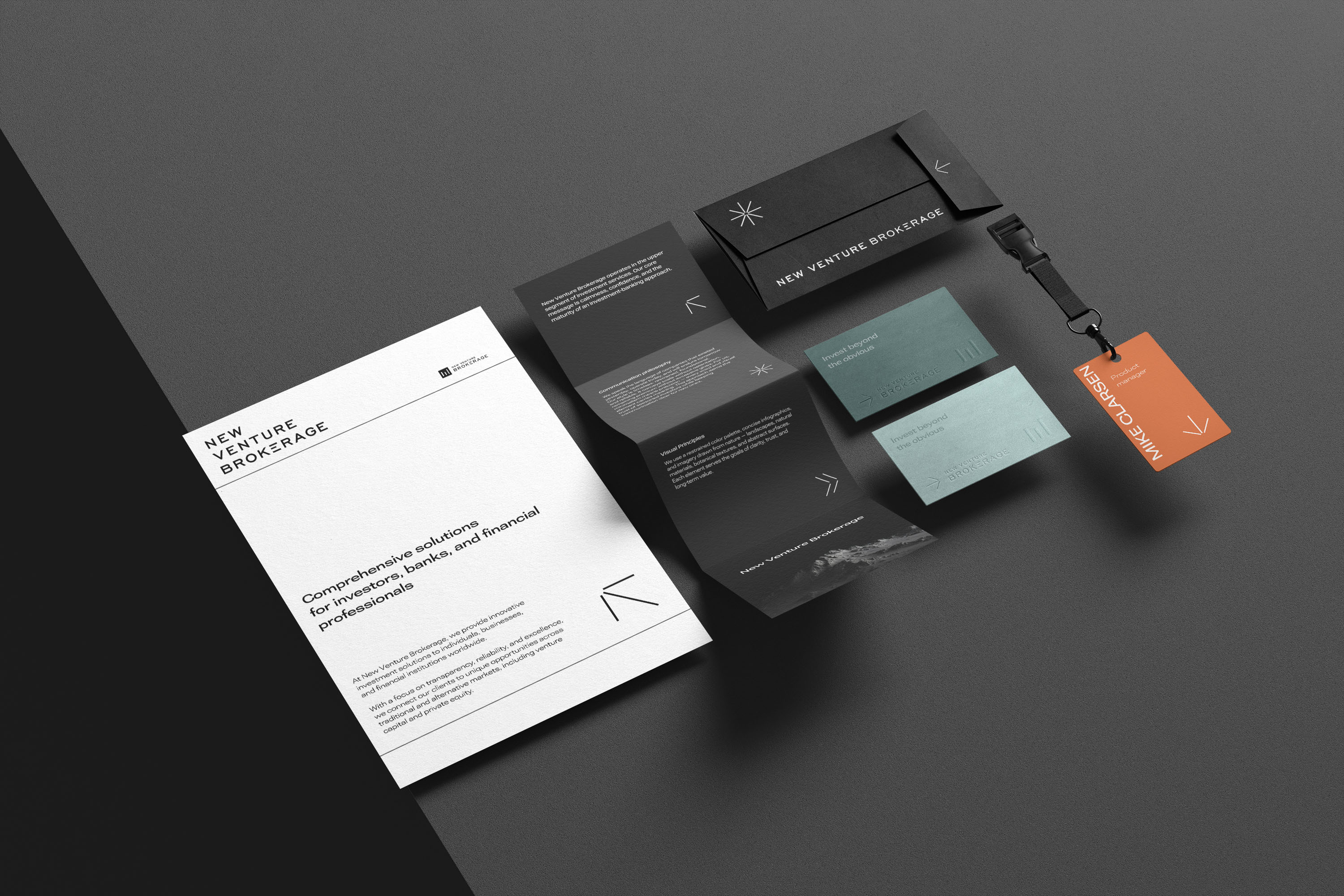 New Venture Brokerage operates in the upper segment of investment services. Their core message is calmness, confidence, and the maturity of an investment-banking approach.